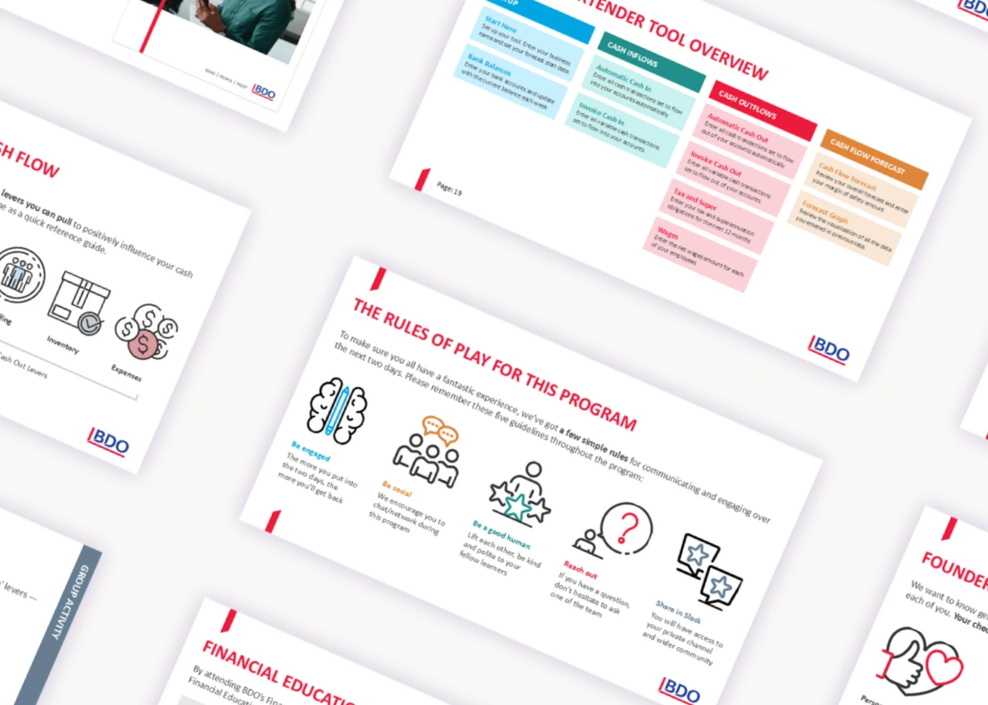 BDO needed clear, well-structured materials to support its educational programs for entrepreneurs. The goal was to translate complex business concepts into accessible, engaging content that could be used across courses, workshops, and self-guided learning formats.