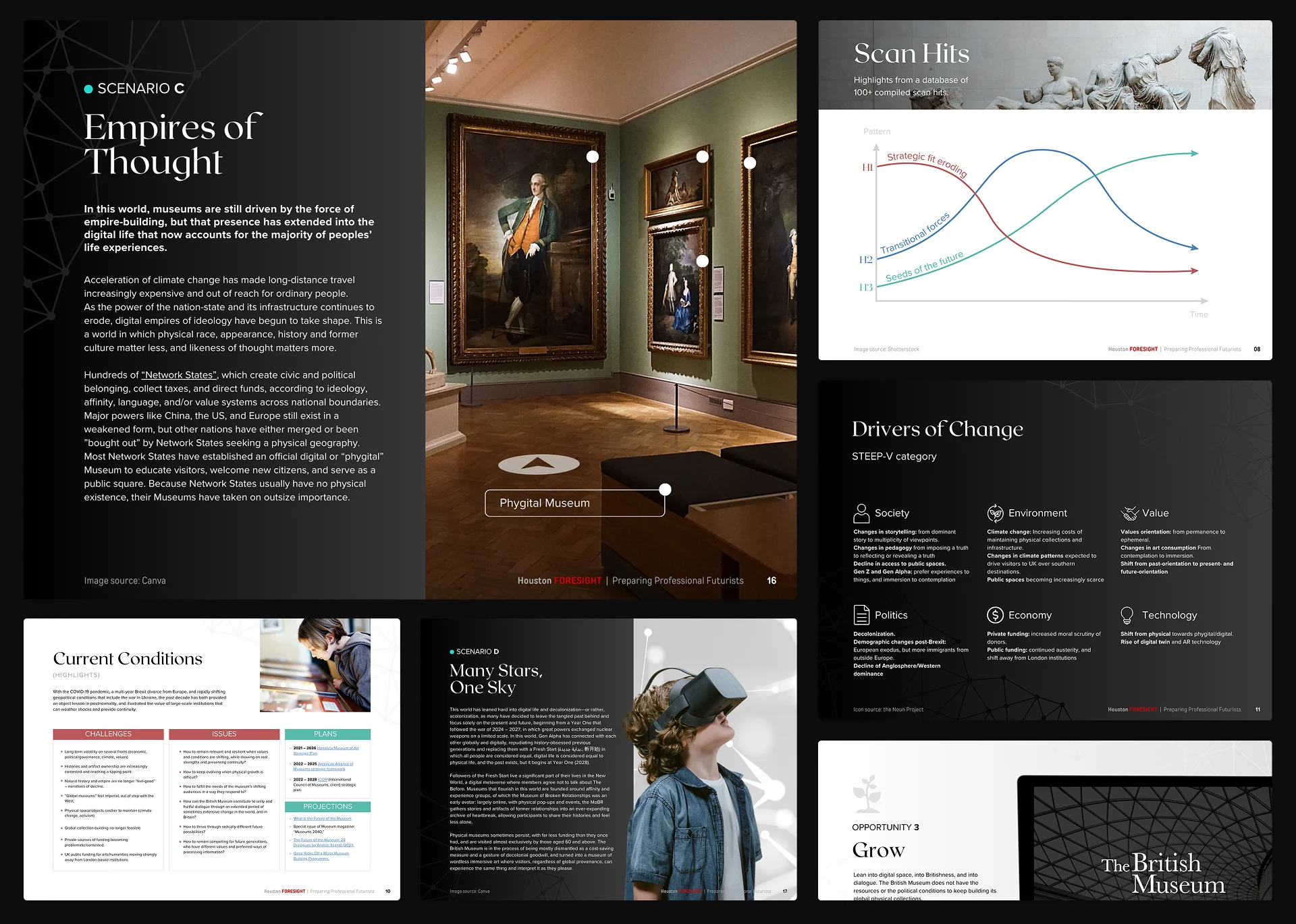 The challenge was to translate complex futures research into a clear, compelling narrative that could provoke discussion, support strategic thinking, and reframe the museum’s role in a shifting global landscape.